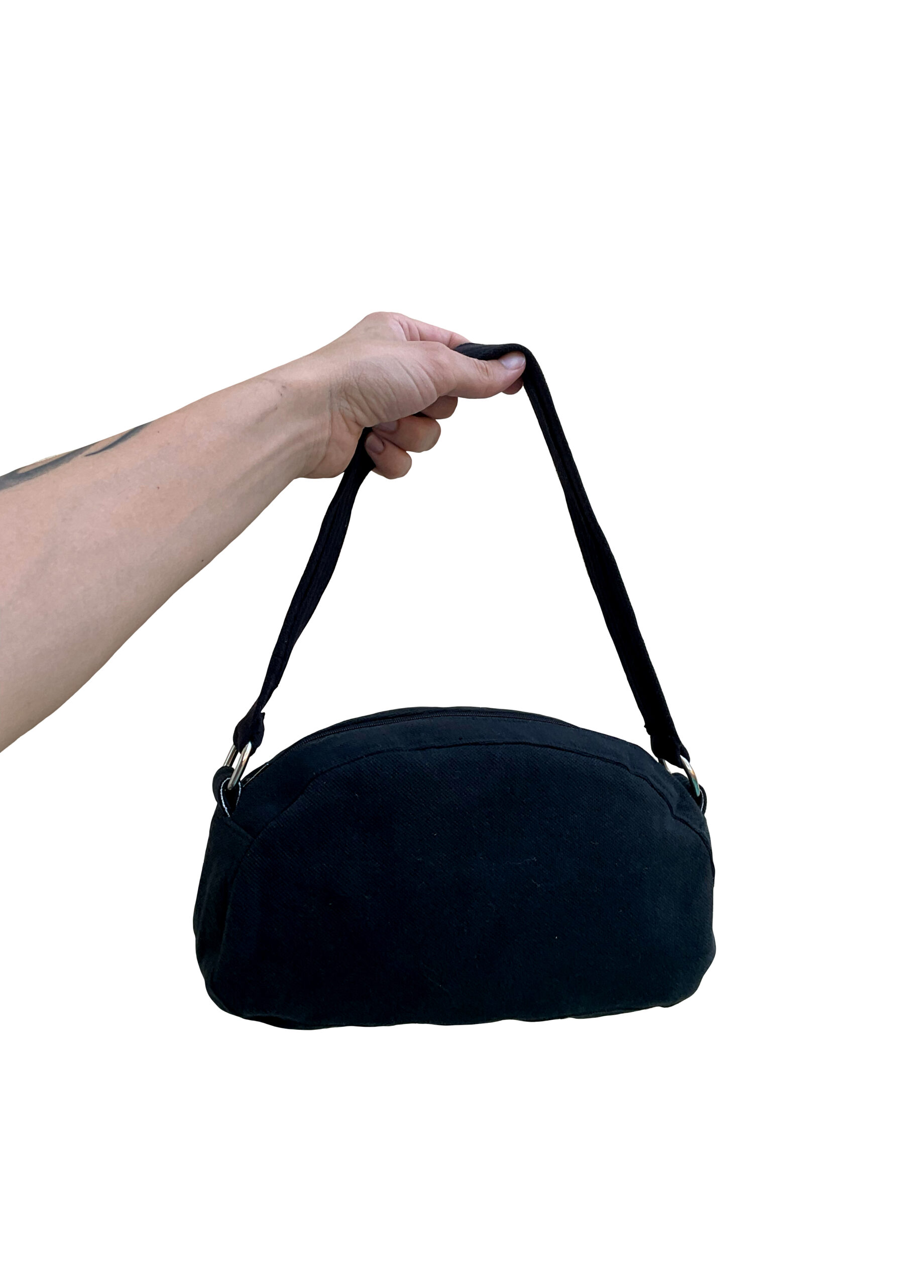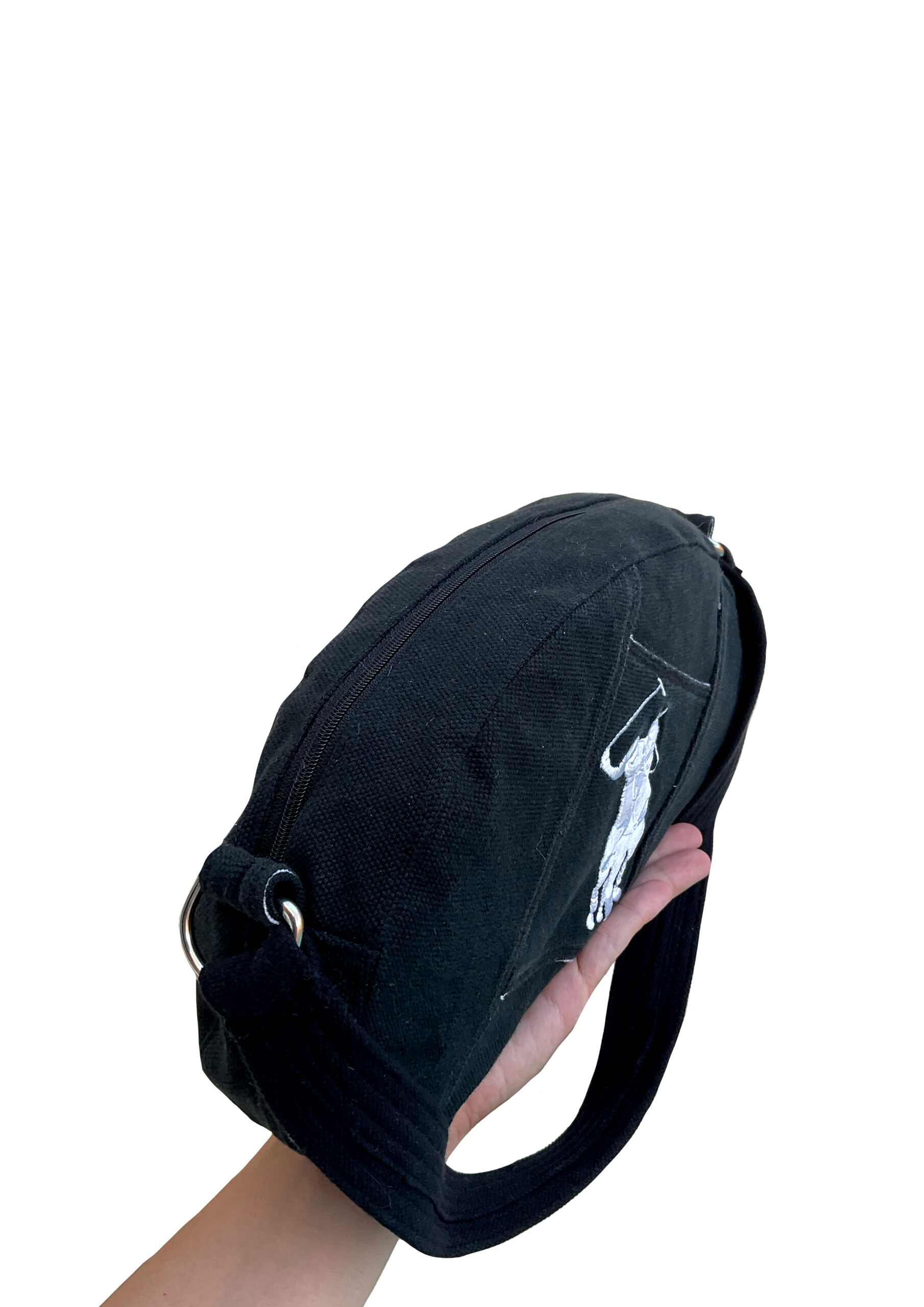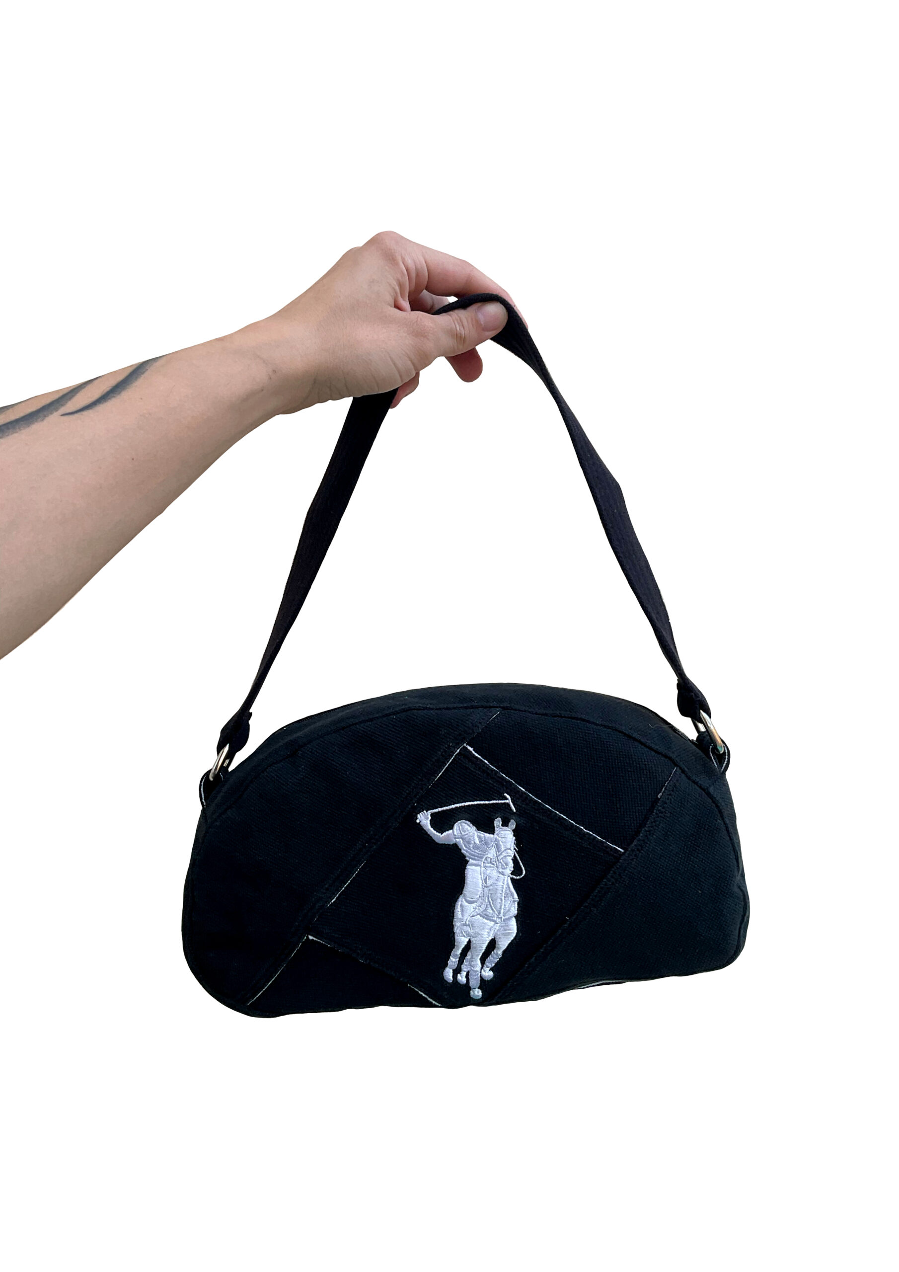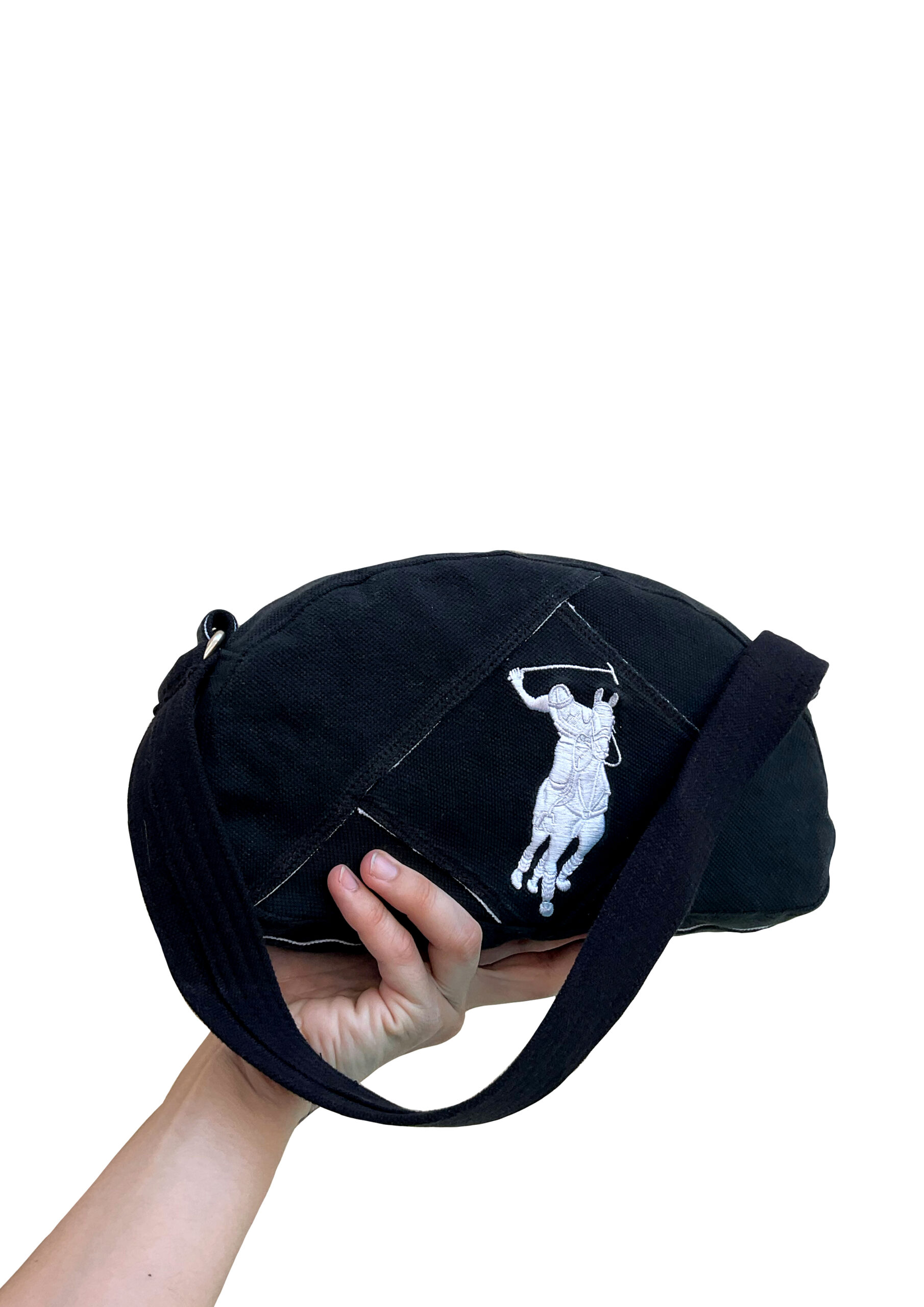 Bolso confeccionado a mano a partir de una polo marca POLO de segunda mano negro, blanco y gris. Tamaño parecido a una riñonera y asa corta, (medidas 27 cm x 14 cm x 6 cm) entra movil, cartera y llaves sin problema. Longitud del asa 58 cm incluidas anillas, se le puede colocar una correa mas larga con mosquetones. Exterior negro completo, con logo de Polo bordado en blanco, original de la prenda y forro interior del mismo material.