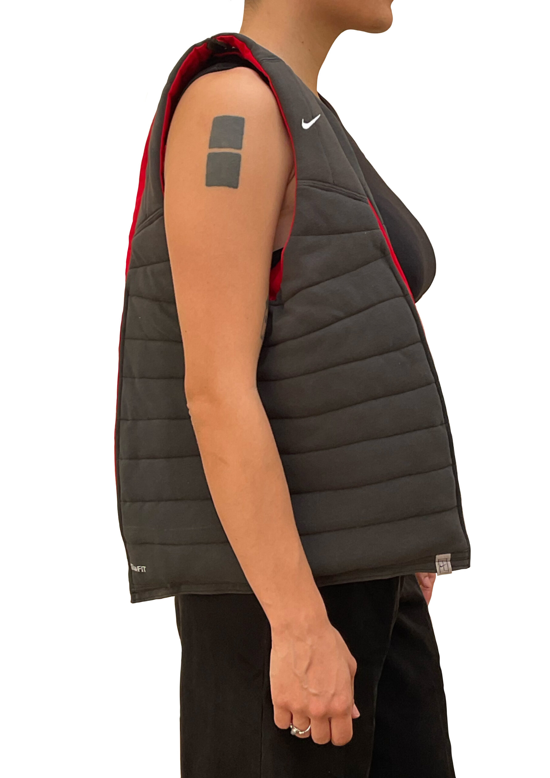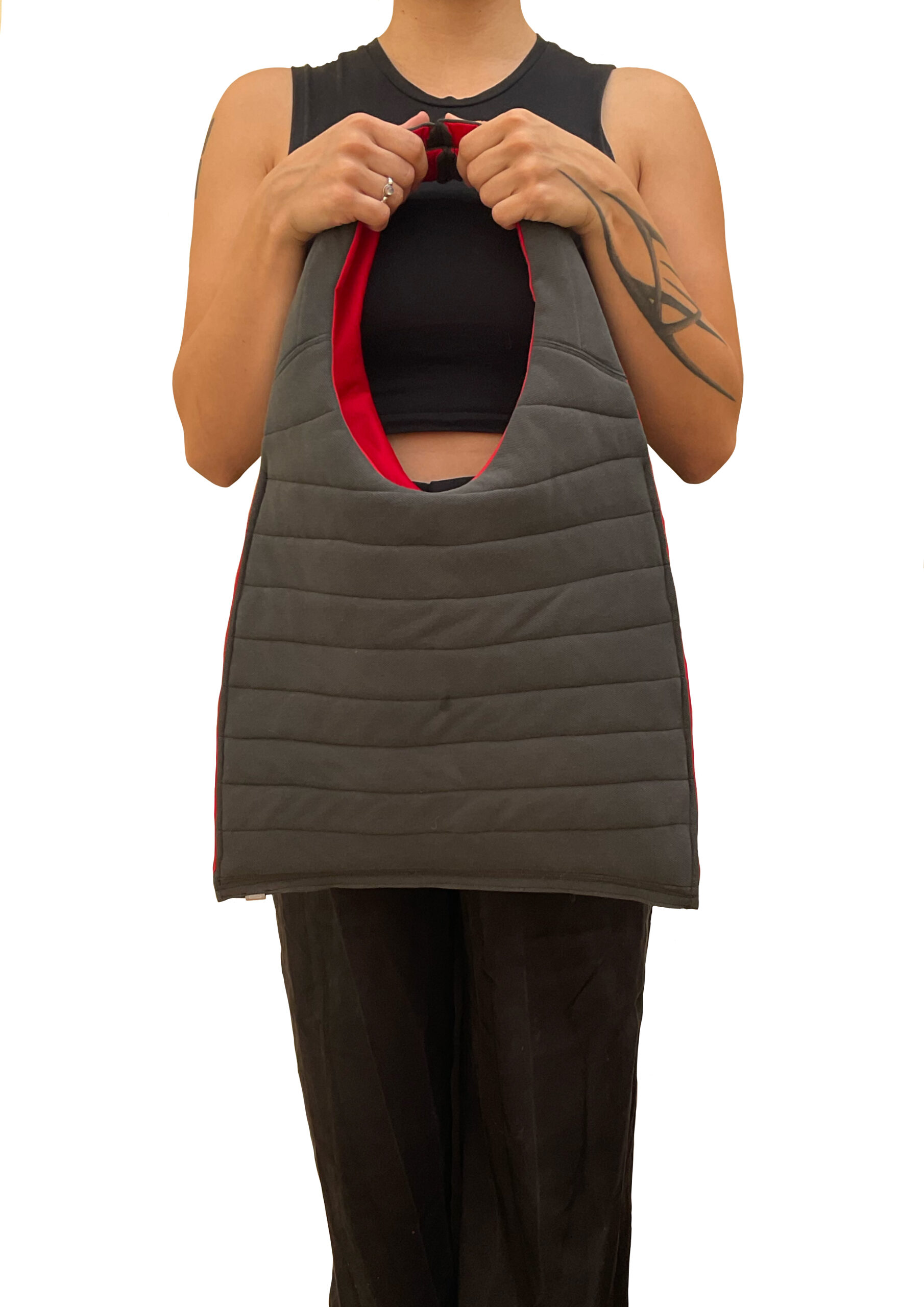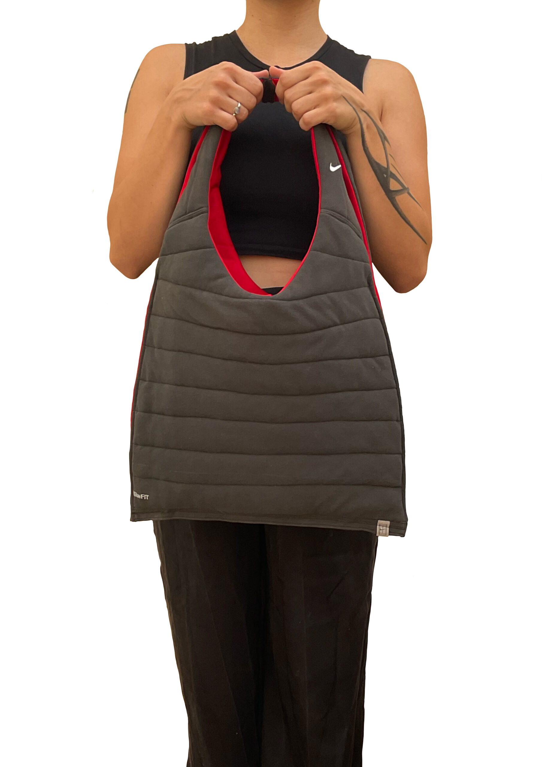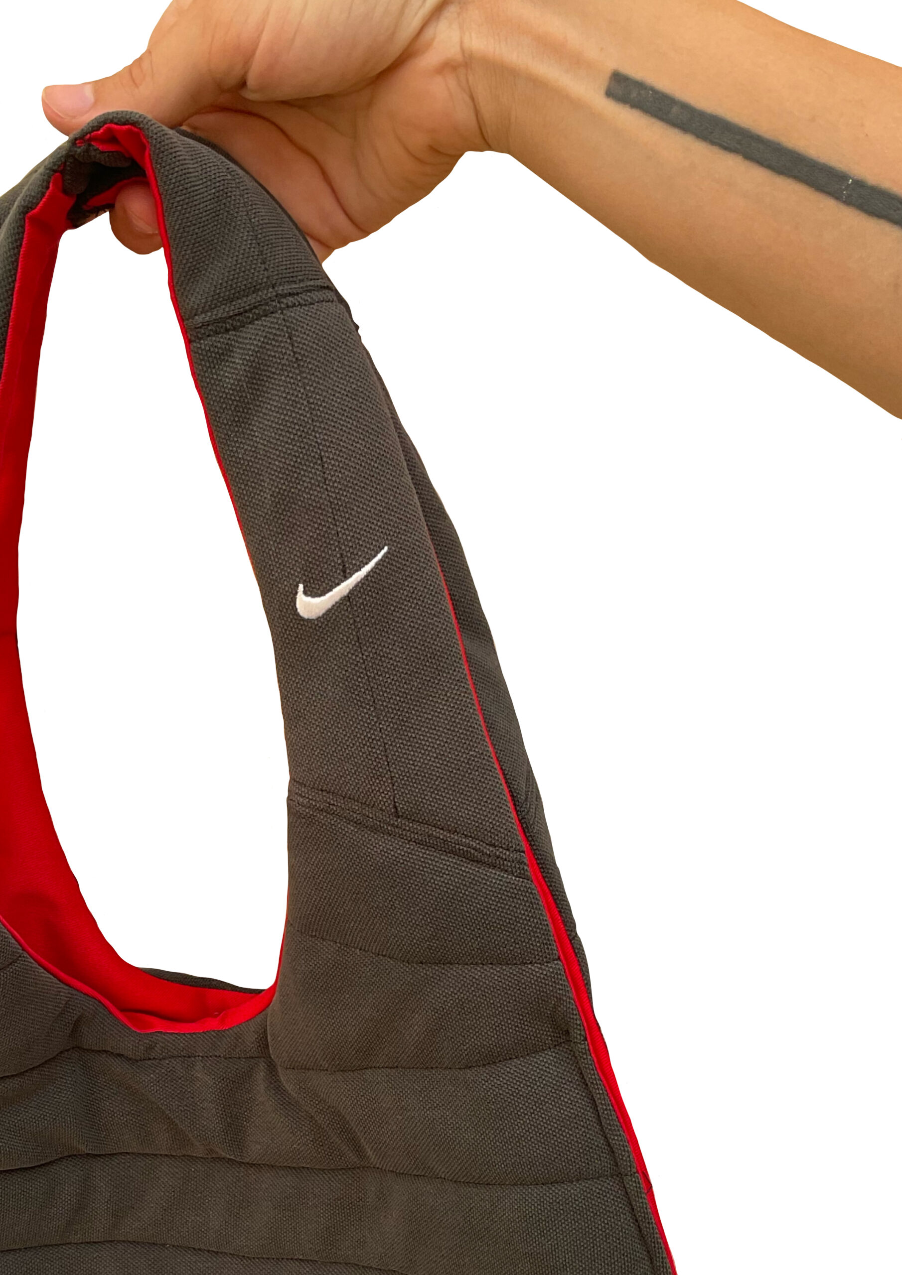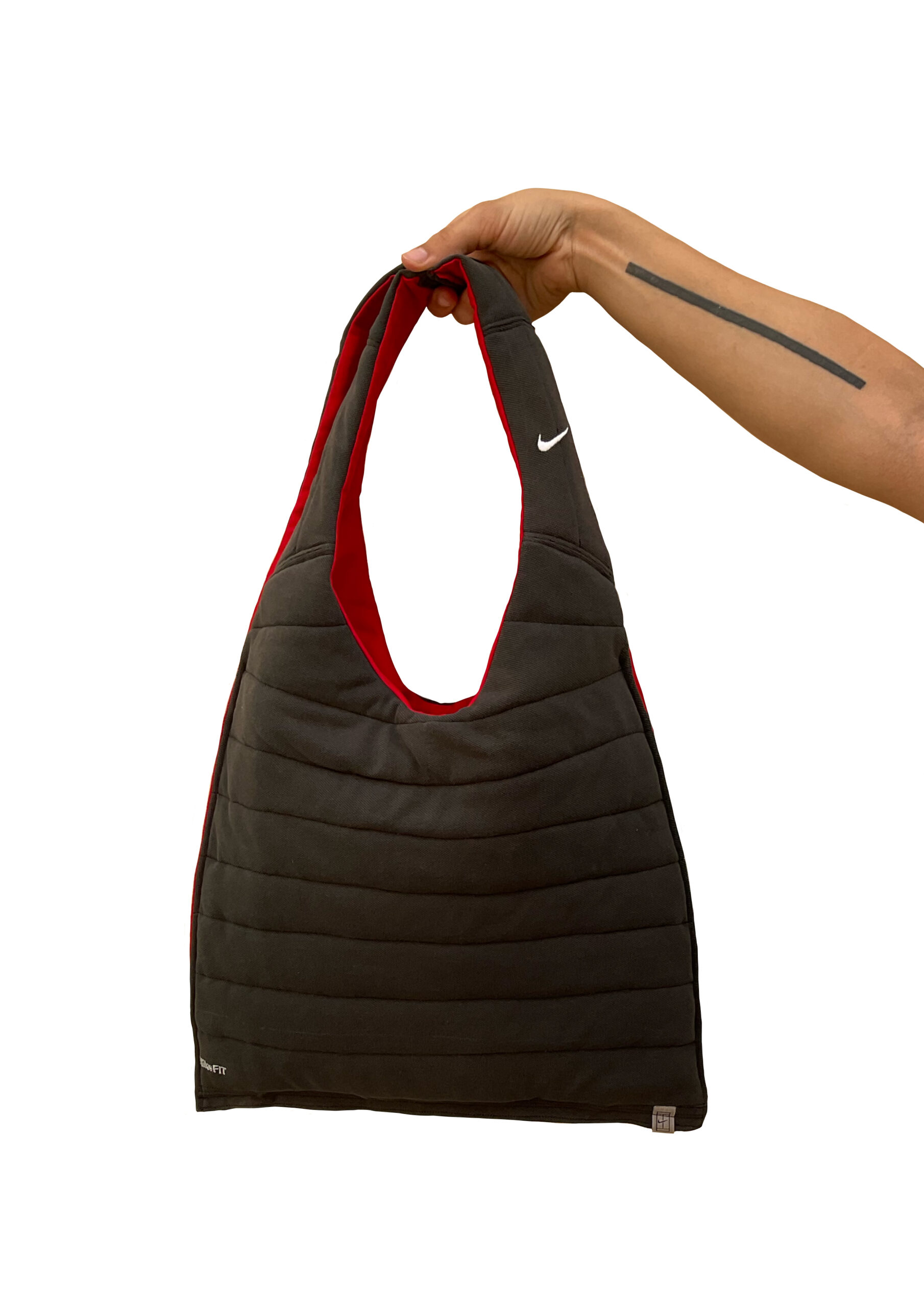 Bolso confeccionado a mano a partir de un polo de Nike de segunda mano. Exterior negro acolchado cosido a rayas y con el logo de Nike en una de sus asas, interior del bolso en color rojo. Medidas 60 cm de altura, 38 cm de ancho y 53 cm de longitud del asa.
