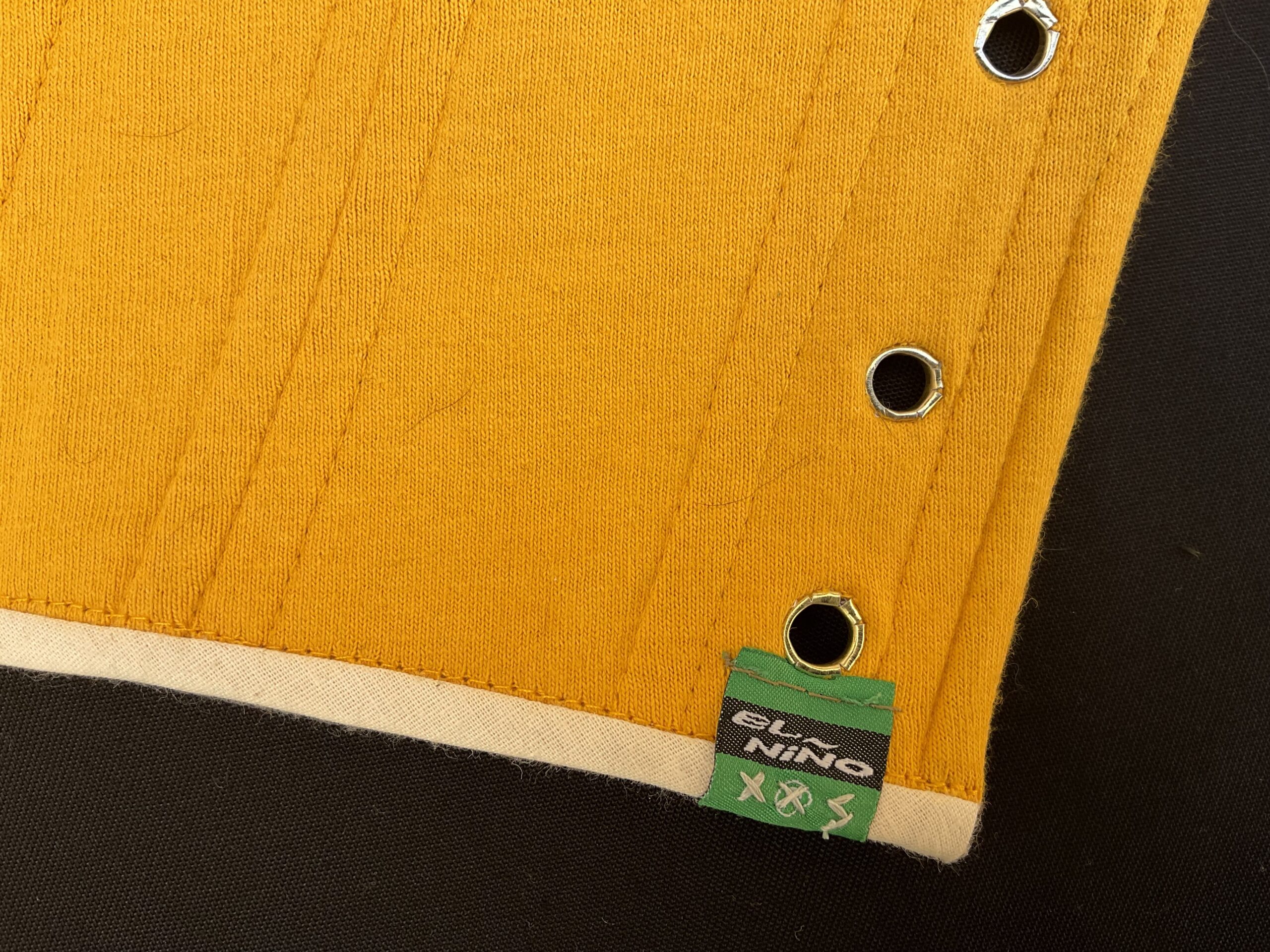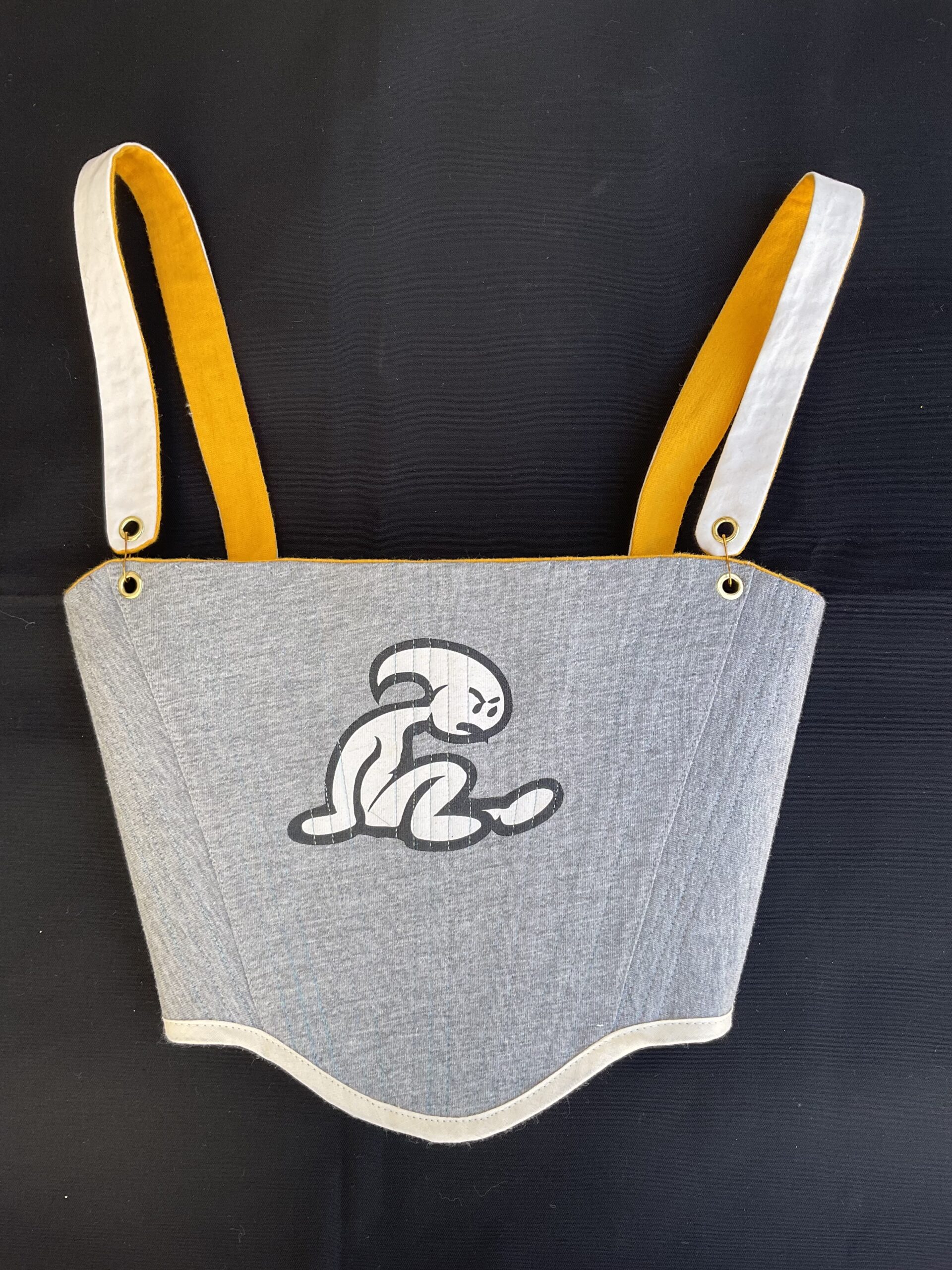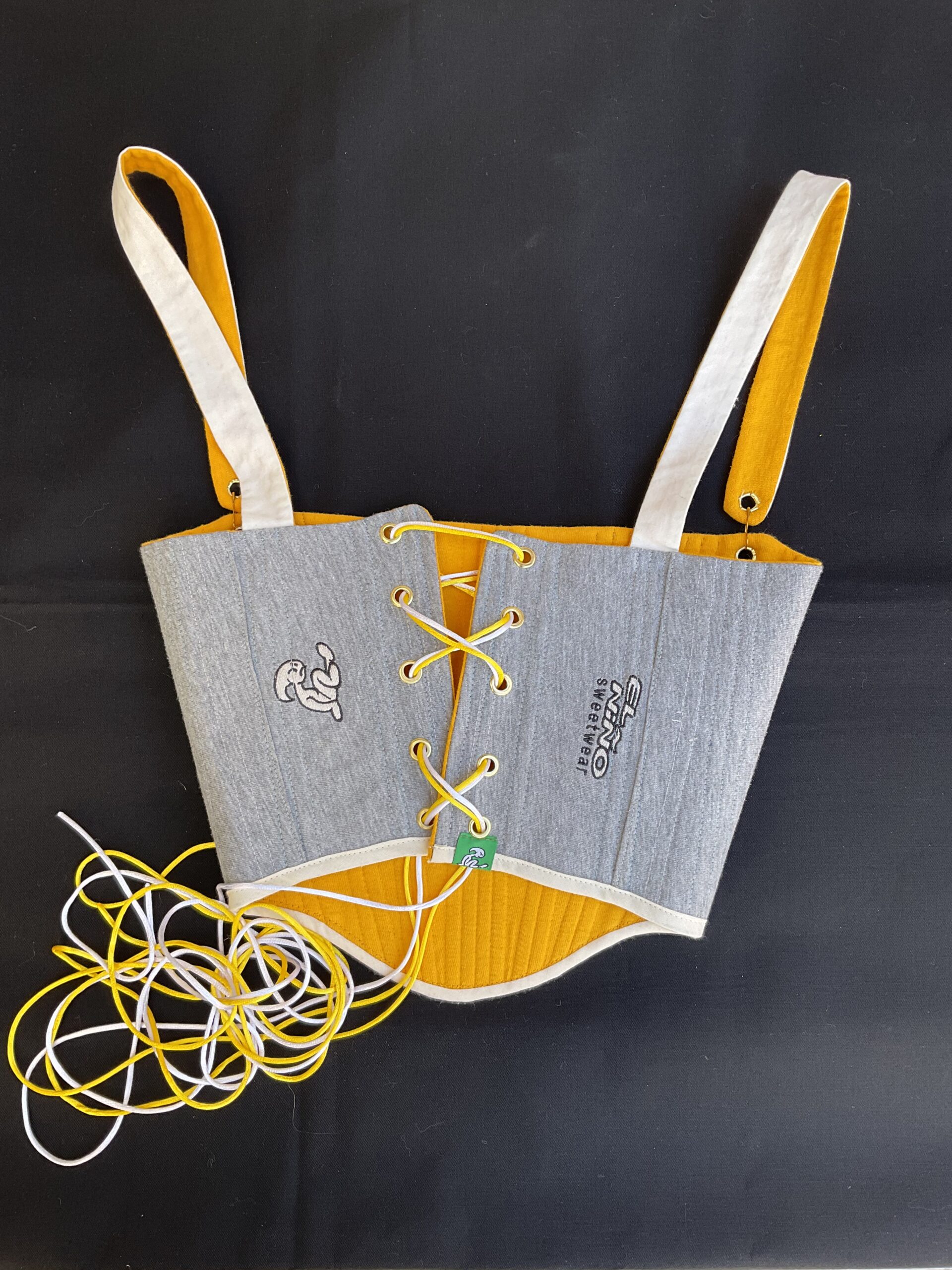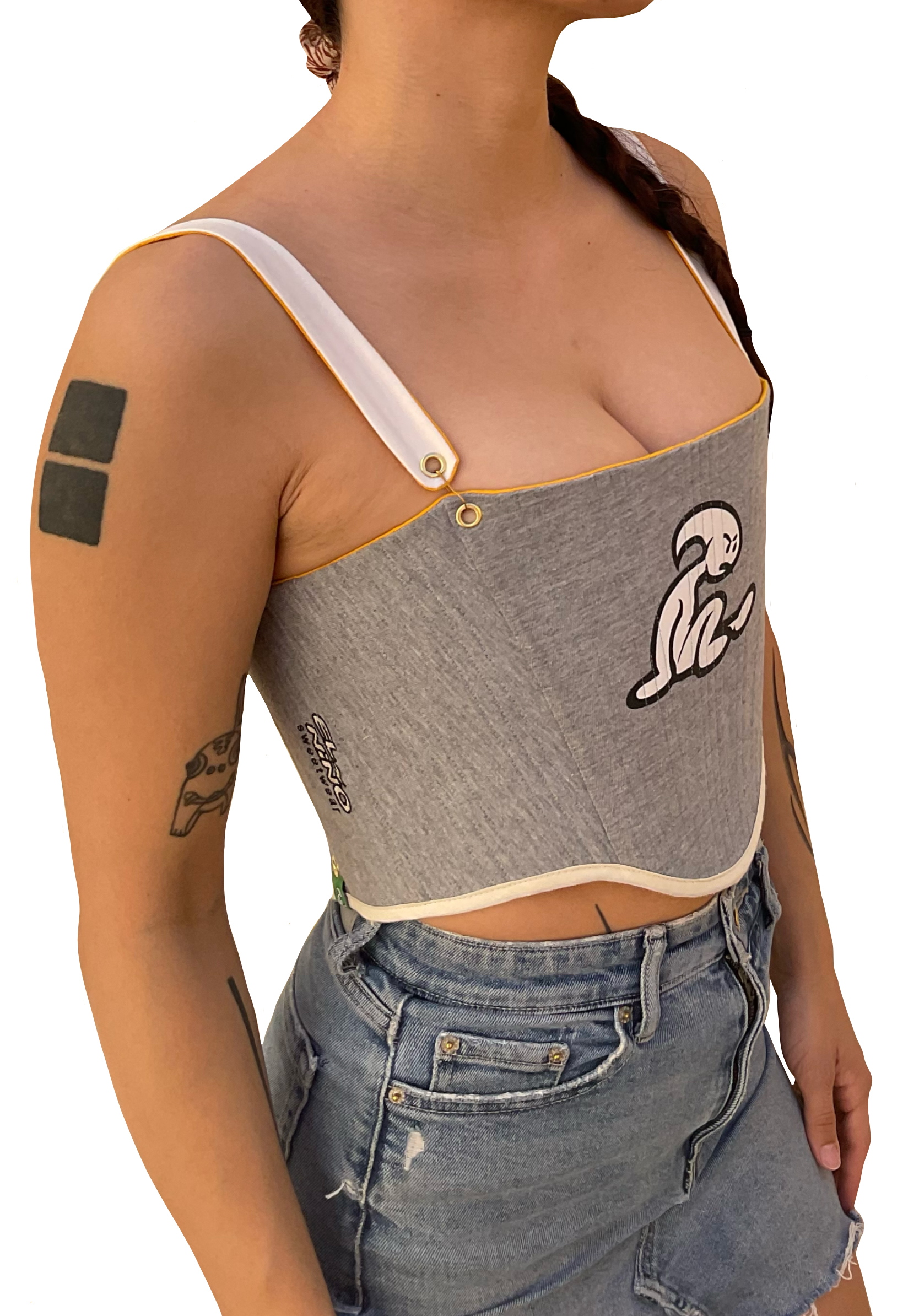 Corsé confeccionado a mano a partir de una camiseta del Niño de segunda mano. Talla XXXS equivale a una 30-32 europea. Medidas ajustables de busto (65-75) y de cintura (60-65) . Lleva varillas internas para un mejor ajuste en todo el corsé, exterior en gris, interior en amarillo y remaches dorados.