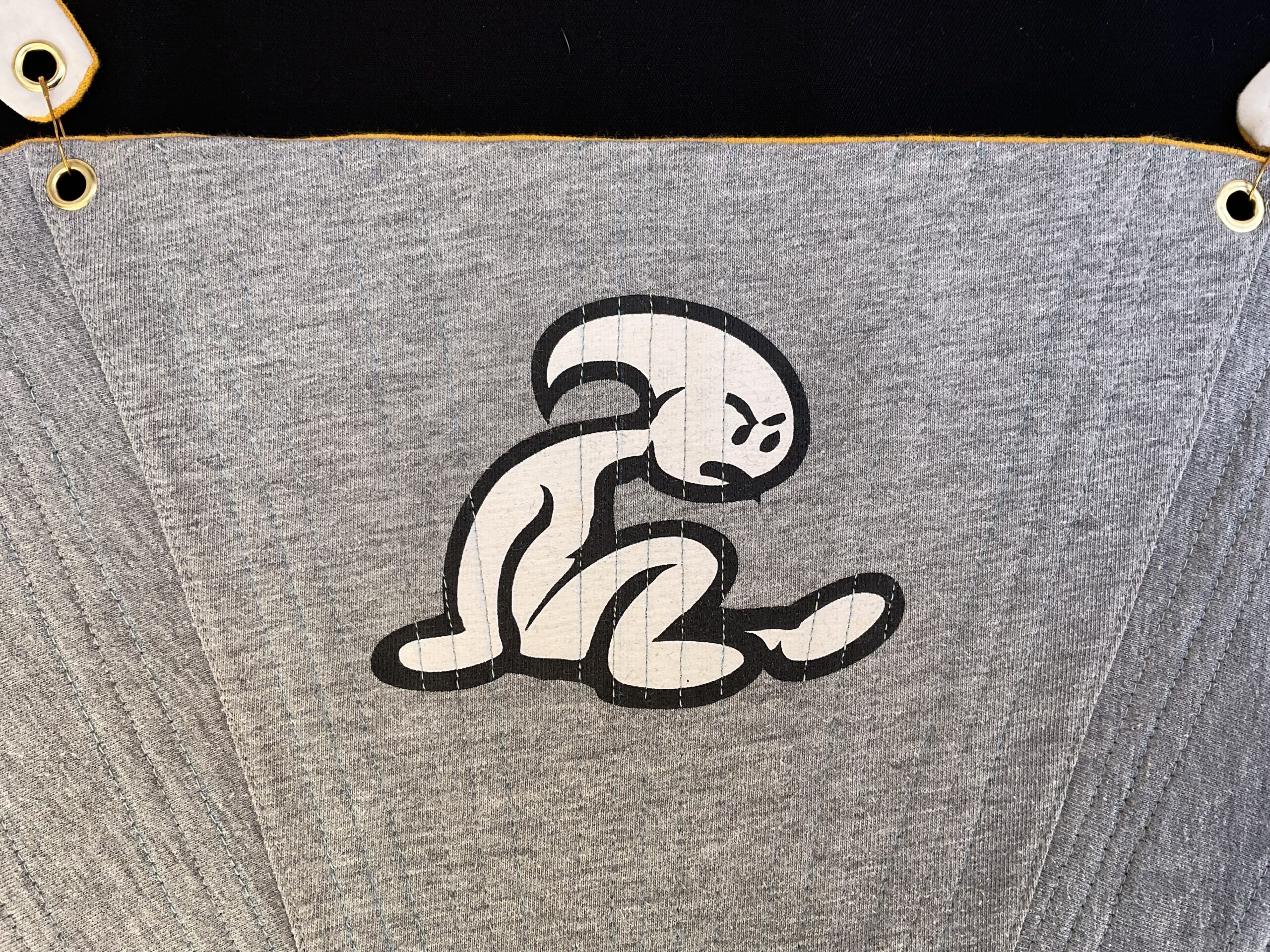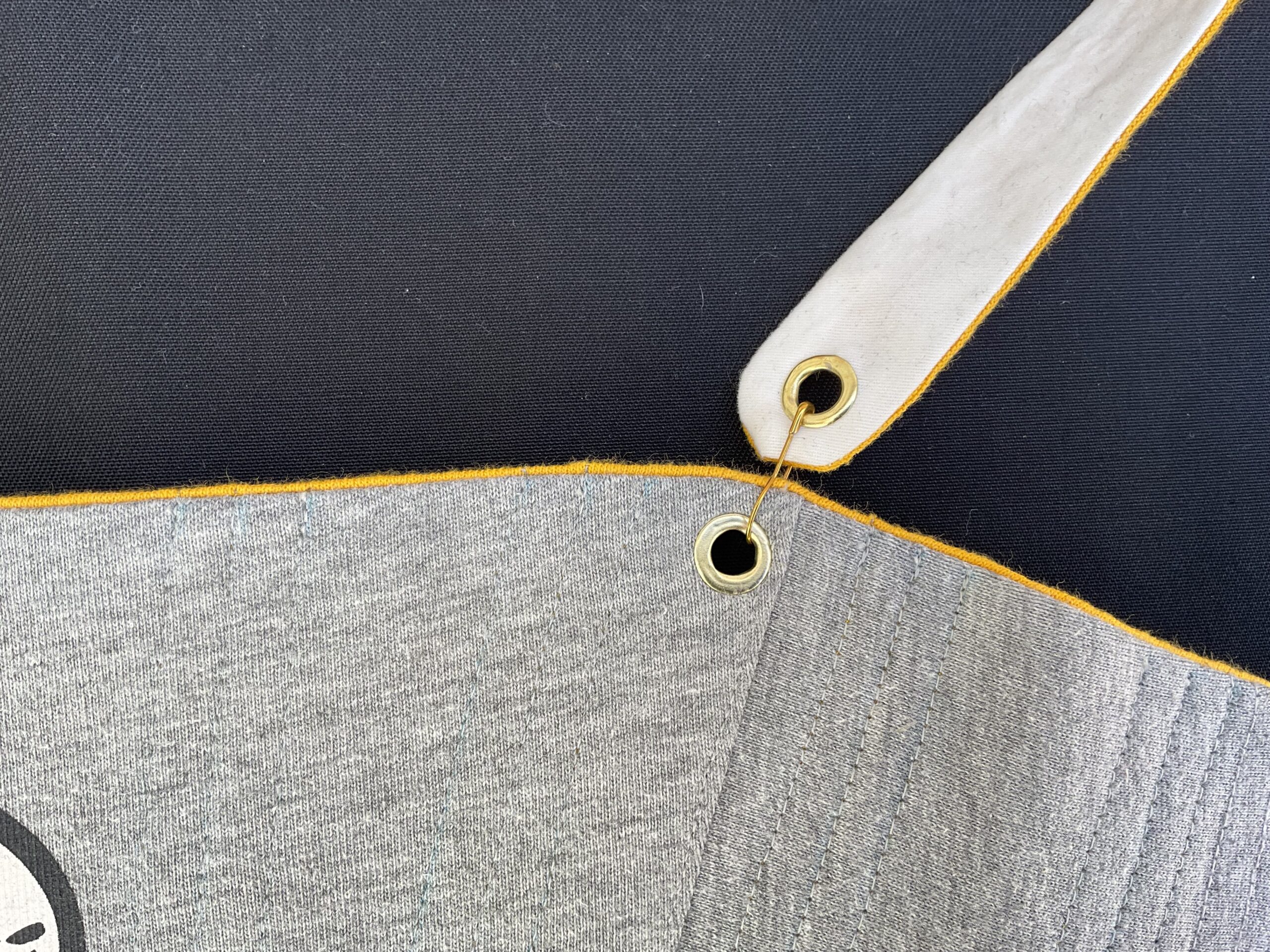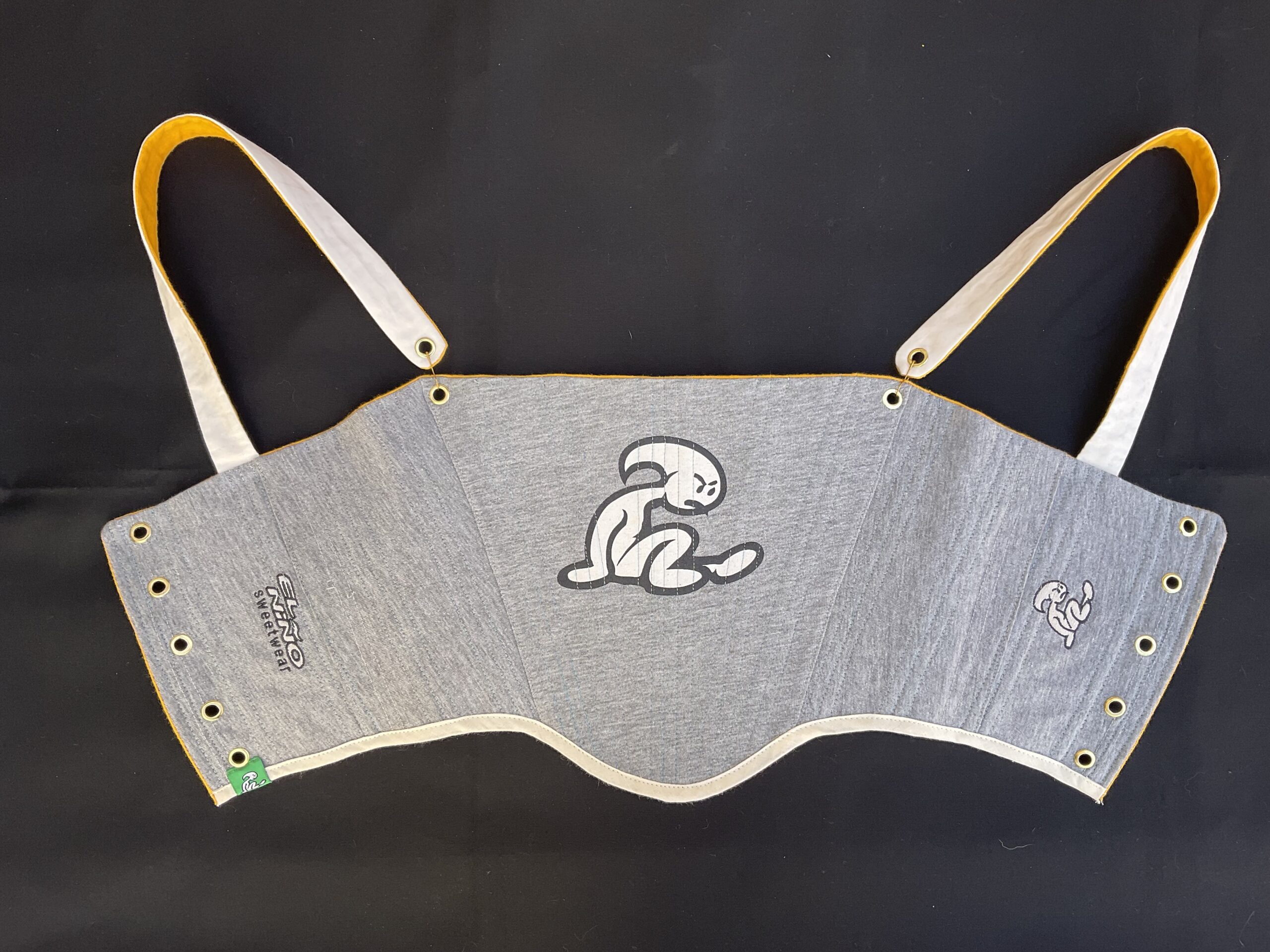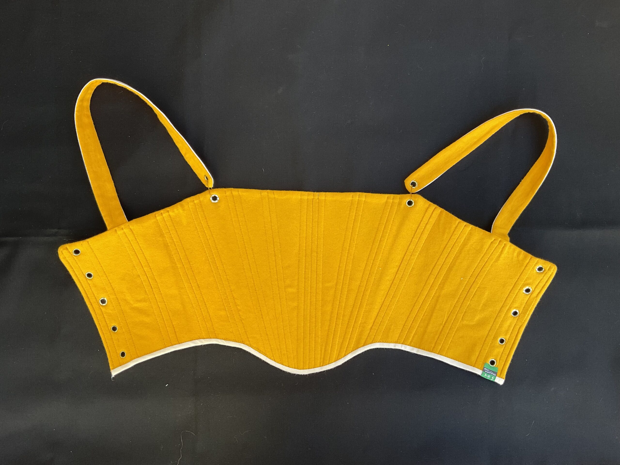 Corsé confeccionado a mano a partir de una camiseta del Niño de segunda mano. Talla XXXS equivale a una 30-32 europea. Medidas ajustables de busto (65-75) y de cintura (60-65) . Lleva varillas internas para un mejor ajuste en todo el corsé, exterior en gris, interior en amarillo y remaches dorados.