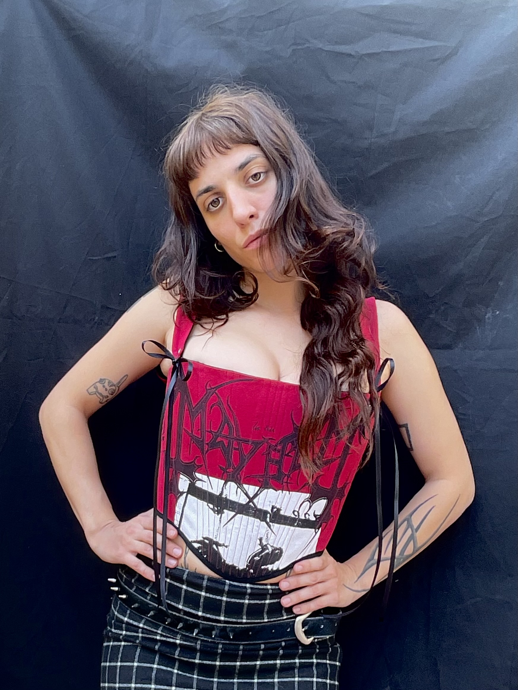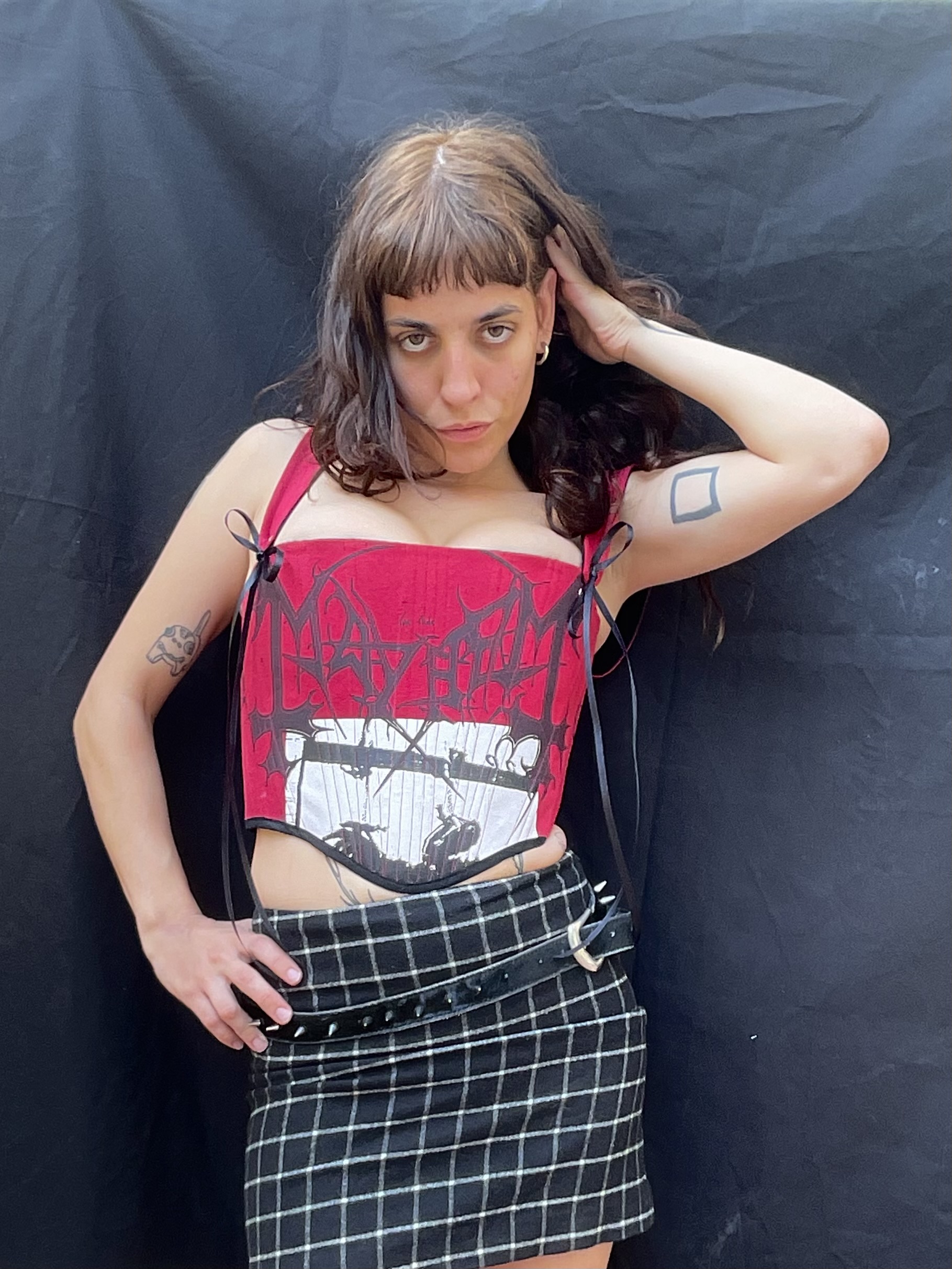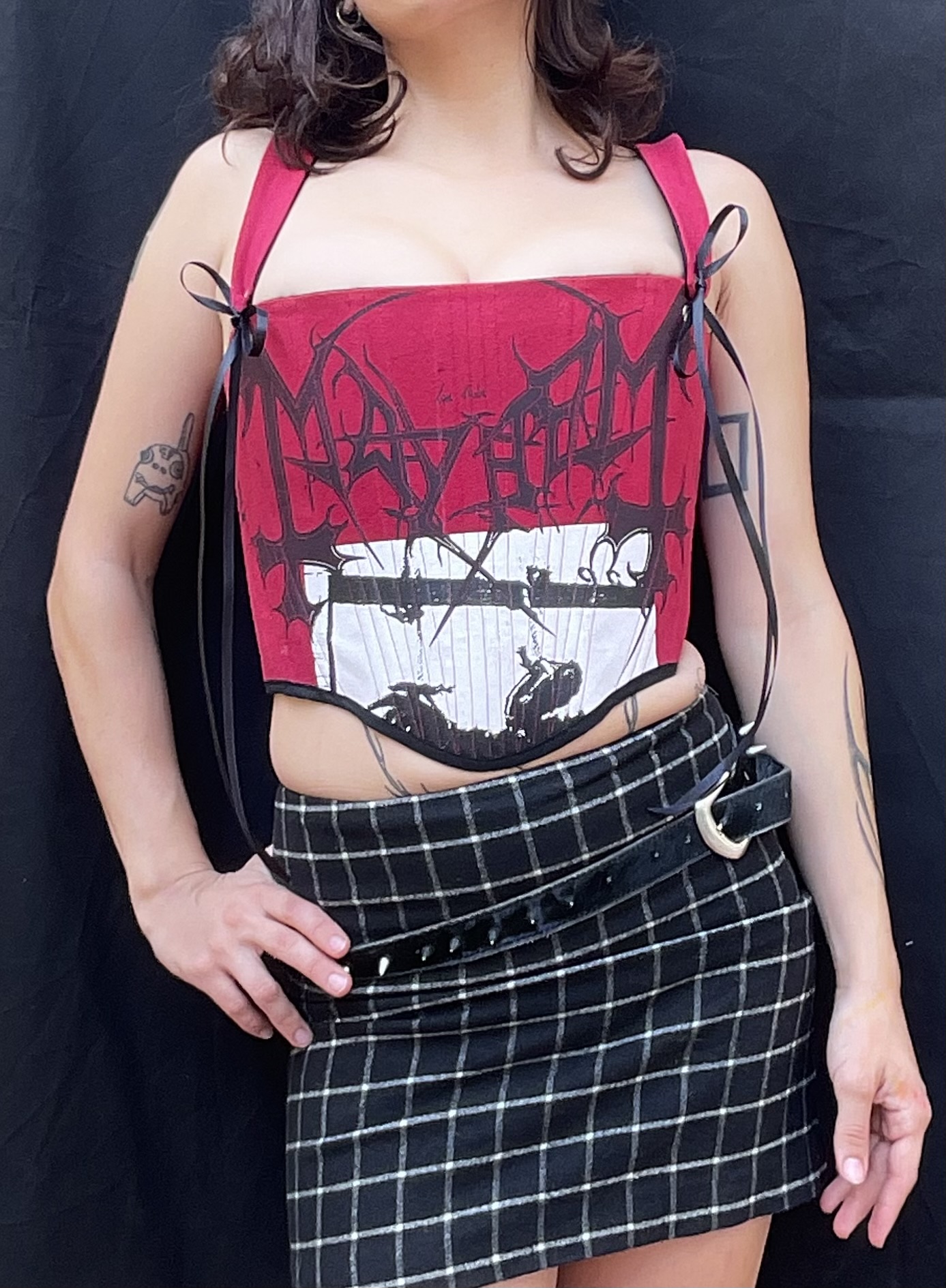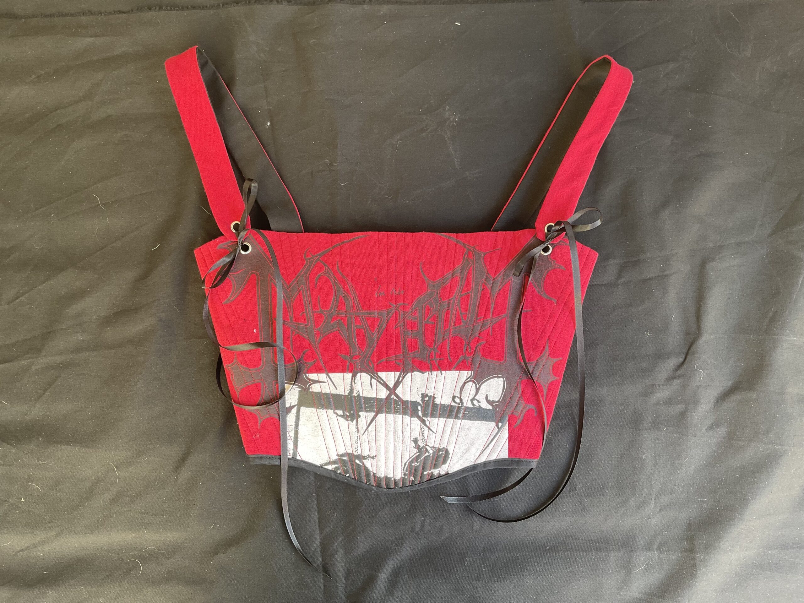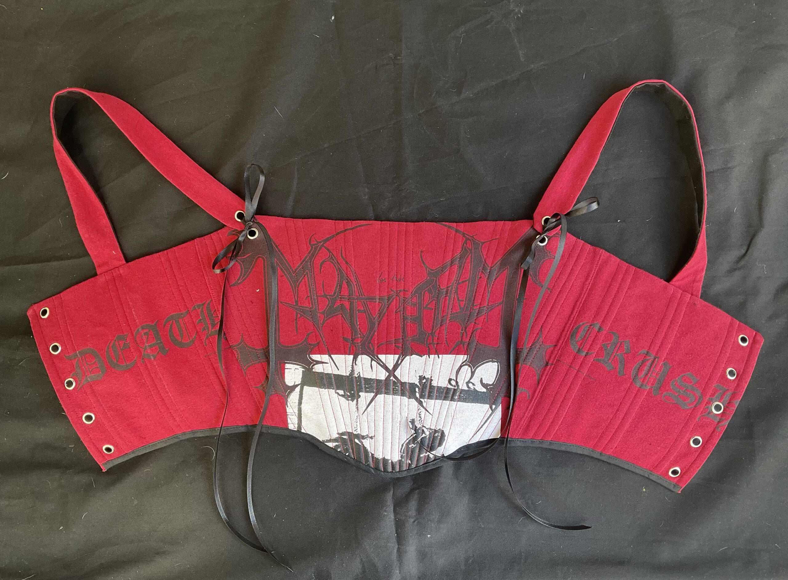 Corsé confeccionado a mano a partir de una camiseta de Mayhem de segunda mano. Talla M-L equivale a una 38-40 europea. Medidas ajustables de busto (85-90) y de cintura (70-75) . Lleva varillas internas para un mejor ajuste en todo el corsé, exterior en rojo, interior en negro y remaches plateados.